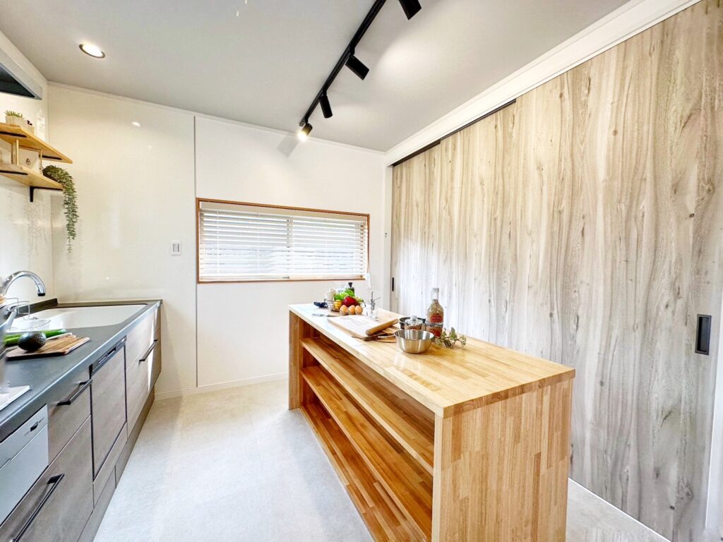 キッチンの背面には木製の造作カウンターと大容量収納を設置。